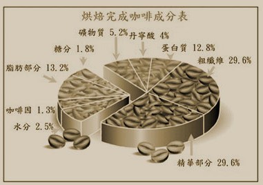 矿物质:有石灰、铁质、硫磺、碳酸钠、磷、氯、硅等,因所占的比例极少影响咖啡的风味并不大,综合起来只带来稍许涩味。